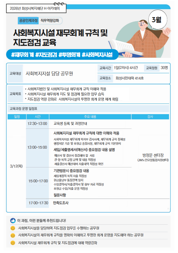 ※ 해당 강좌는 복지시설 운영관리 담당 공무원 대상 과정입니다. (별도 신청 및 선발 대상자에게만 개별 안내 및 운영)