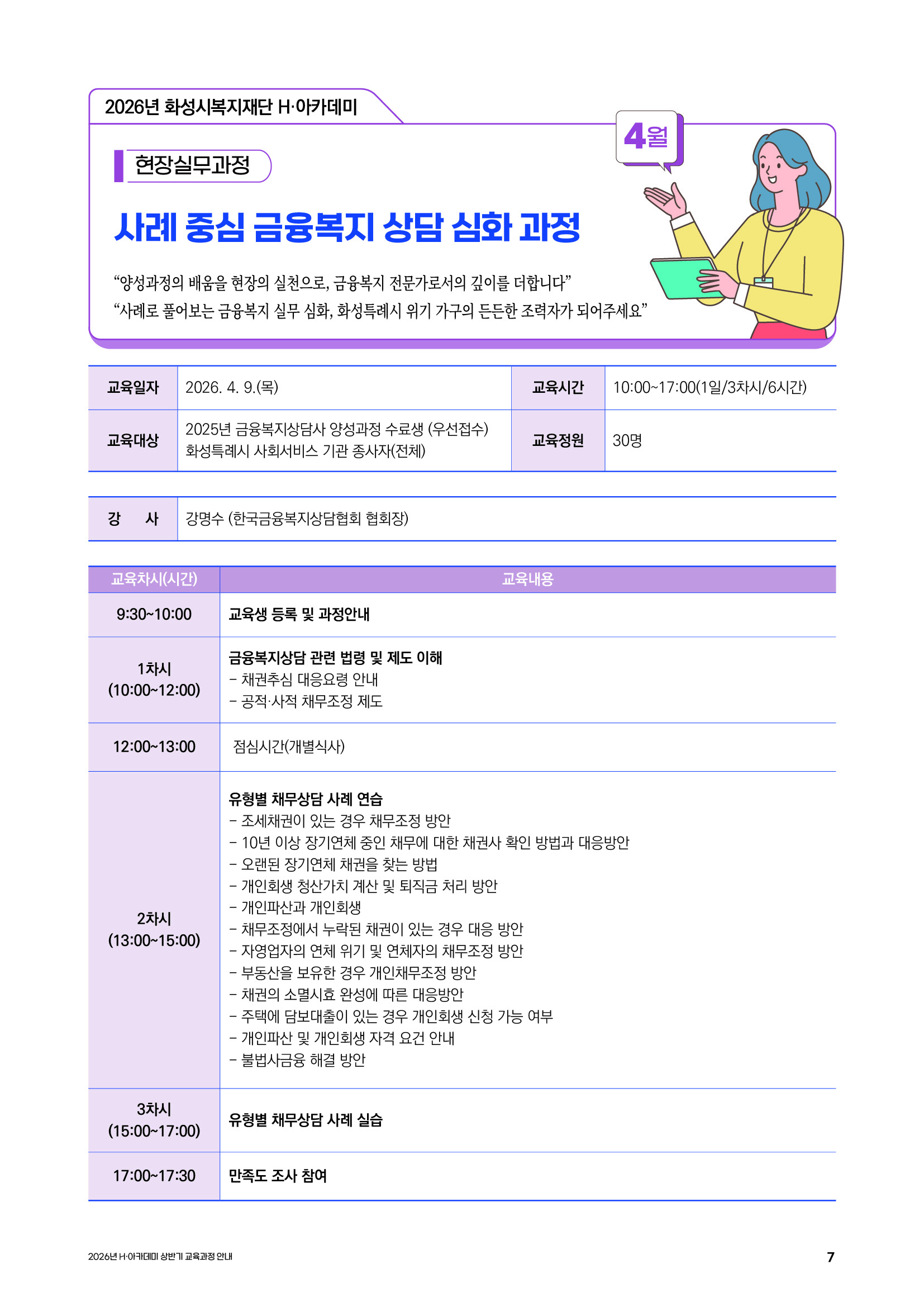 | 교육과정명 | 신청중 현장실무과정 사례 중심 금융복지 상담 심화 과정 | ||