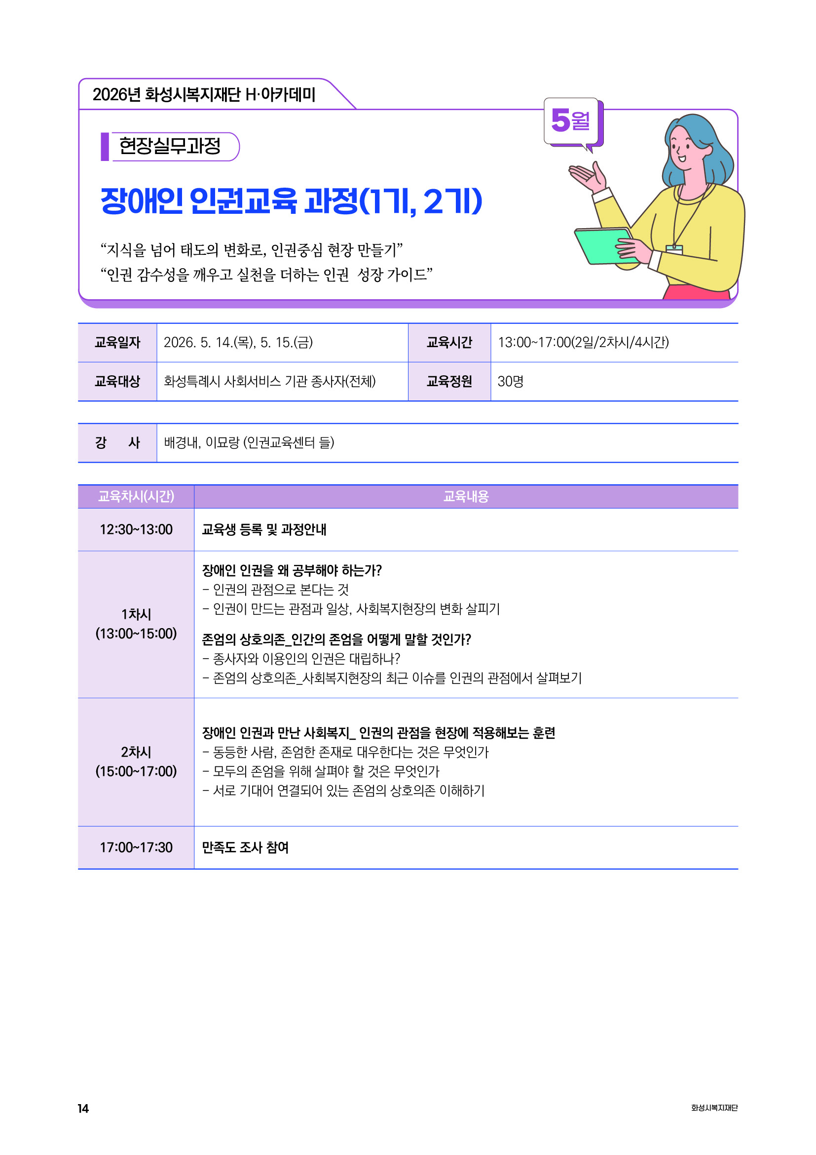 | 교육과정명 | 신청중 현장실무과정 장애인 인권교육 과정(2기) | ||