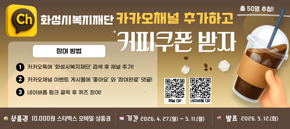 공지사항 공지사항 2026년 화성시 공공기관 경영실적평가 용역 고객만족도 조사” 관련 개인정보 제3자 제공사항 알림 “2026년 화성시 공공기관 경영실적평가 용역 고객만족도 조사” 관련 개인정보 제3자 제공사항 알림 □ 화성시복지재단은 정보주체의 동의, 법률의 특별한 규정 등「개인정보보호법」제17조 및 제18조에 해당하는 경우에만 개인정보를 제3자에게 제공합니다. □ 화성시복지재단은 다음과 같이 개인정보를 제3자에게 제공하고 있습니다.ㅇ 제공 일자 : 2026.03.12. ~ 2026.06.30.ㅇ 제공의 법적 근거 : 「개인정보보호법」제18조제2항제2호, 「공공기관의 운영에 관한 법률」제13조제2항, 동법시행령 제17조제3항ㅇ 제공받는 자의 개인정보 이용 목적 : 2026년 화성시 공공기관 경영실적평가 용역 고객만족도 조사 실시ㅇ 제공하는 개인정보 항목 : 고객명, 전화번호, 서비스 받은 업무명(사업)ㅇ 제공받는 자의 보유기간 : “2026년 화성시 공공기관 경영실적평가 용역” 완료시까지ㅇ 개인정보 파기 절차 및 파기 방법 : 조사 완료 후 정보 일체에 대해 복구 불가능한 방식으로 일괄 영구 파기 2026-04-22 공지사항 화성시복지재단 노사협의회 설치 관련 공고 화성시복지재단에서는 「근로자참여 및 협력증진에 관한 법률」제4조에 따라 노사협의회를 설치하고자 합니다. 노사협의회 설치에 앞서, 관련한 설치준비위원회 구성을 진행하오니,노사협의회 설치준비위원회에 근로자측 준비위원으로 참여하기를 희망하는 분은 붙임의 신청서를 작성하여 담당자(hj0125@hcare.kr)에게 제출하여 주시기 바랍니다. 2026-04-16 공지사항 2026년 화성특례시 사회서비스 종사자 휴식지원사업「힐링UP」참가자 선정공고 2026년 화성특례시 사회서비스 종사자 휴식지원사업 「힐링UP」참여자를 선정공고 합니다.자세한 사항은 첨부된 공고문을 참고해주시기 바랍니다. 2026-04-03 공지사항 화성시복지재단 2026년도 1차 직원 공개채용(블라인드) 최종 합격자 공고 화성시복지재단 2026년도 1차 직원 공개채용(블라인드) 최종 합격자를 붙임과 같이 공고합니다. 2026-03-24 공지사항 화성시복지재단 2026년도 1차 직원 공개채용(블라인드) 인적성전형 합격자 공고 화성시복지재단 2026년도 1차 직원 공개채용(블라인드) 인적성전형 합격자를 붙임과 같이 공고합니다. 2026-03-10 공지사항 2026년 H·아카데미 상반기 교육과정 안내문 (3월~6월) 2026년 상반기, 화성특례시 사회서비스 종사자 여러분의 직무 역량 강화와 성장을 돕기 위한 교육과정을 아래와 같이 공고합니다.교육 참여를 희망하시는 분들께서는 아래 안내문 내용을 확인하시고, 각 교육과정별 신청 기간을 엄수하여 교육 참여에 차질 없으시길 바랍니다. [ 목 차 ]- H·아카데미 수료기준 및 준수사항- 2026년 H·아카데미 상반기 교육일정- 2026년 H·아카데미 교육계획서 (현장실무과정 / AI디지털과정) 2026-03-09 공지사항 화성시복지재단 2026년도 1차 직원 공개채용(블라인드) 서류전형 합격자 공고 화성시복지재단 2026년도 1차 직원 공개채용(블라인드) 서류전형 합격자를 붙임과 같이 공고합니다. 2026-03-05 공지사항 2026년 화성특례시 사회서비스 종사자 휴식지원사업「힐링UP」참가자 모집공고 1. 모집내용□ 모집대상: 화성특례시 사회서비스 종사자 (화성특례시 사회서비스 기관 1년 이상 재직한 중간관리자 이하 종사자)□ 지원내용: 문화활동비 및 국내여행 경비지원구분대상인원선정 수지원금개인사회서비스 시설에 재직 중인 실무자1명총 100명1인당 250,000원 지원실무자 모임동일 또는 타 시설 실무자로 구성된 모임3~5명※ 개인·실무자 모임의 최종 선정 인원 및 팀 수는 신청 현황과 심사 결과에 따라 공정하게 결정되며, 전체 지원 규모(100명) 내에서 균형 있게 배분하여 선발 예정 □ 모집유형○ 개인 신청- 대상: 사회서비스 종사자 개인(1인)- 성격: 개인의 선호에 맞춘 자유로운 문화활동 및 국내여행을 통한 휴식 지원- 지원: 선정 시 개인별 지원금(25만원) 지급 및 개별 결과보고 진행 ○ 실무자 모임 신청- 대상: 동일 기관 동료 또는 타 기관 종사자와 함께 활동하고자 하는 3~5인 실무자 모임- 성격: 네트워크 형성, 동료 간 유대감 강화, 소통 등을 위한 모임 단위 휴식 지원- 지원: 대표자 1인이 구성원을 확정하여 신청, 선정 시 구성원 전원 지원금 지급 2. 지원 자격 및 준수 사항□ 지원자격 ○ 「사회복지사업법」 제2조에 근거한 사업을 수행하고 있는 법인·기관·단체 소속의 종사자 ○ 「건강가정기본법」에 따른 가족센터 종사자 ○ 경기도, 화성시 조례에 근거한 사회복지 및 사회서비스 관련 법인·기관·단체 종사자 ○ 「협동조합기본법」에 근거하여 설립된 협동조합에서 복지 및 사회서비스 관련 사업을 수행 하고 있는 조합원 또는 종사자 ○ 화성특례시 사회서비스 분야에 1년 이상 재직하였으며 중간관리자 이하인 실무자 □ 지원조건 ○ (교육) 사전 힐링교육 참여 필수(3회 중 1회 날짜 선택) ○ (활동) 선정 후 4개월 이내 힐링 활동 실시 ○ (ESG) 활동내용에 ESG 반영(제로웨이스트 실천, 플로깅, 대중교통 이용 등) ○ (보고) 활동 종료 후 7일 이내 활동보고서 및 만족도조사 제출 ○ 