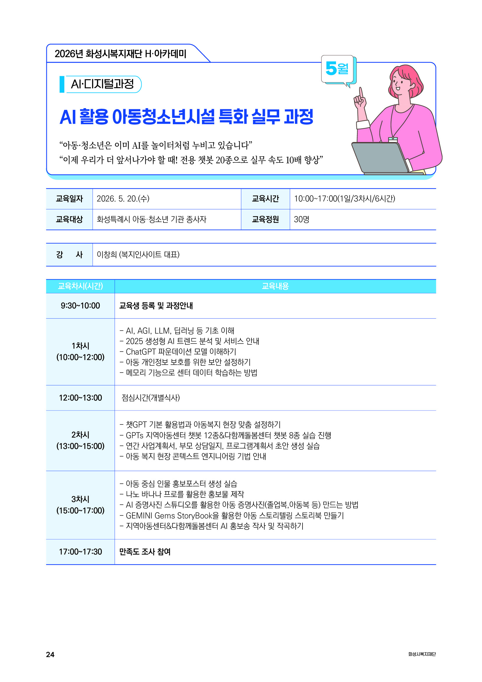 | 교육과정명 | 신청중 AI·디지털과정 AI 활용 아동청소년시설 특화 실무 과정 | ||