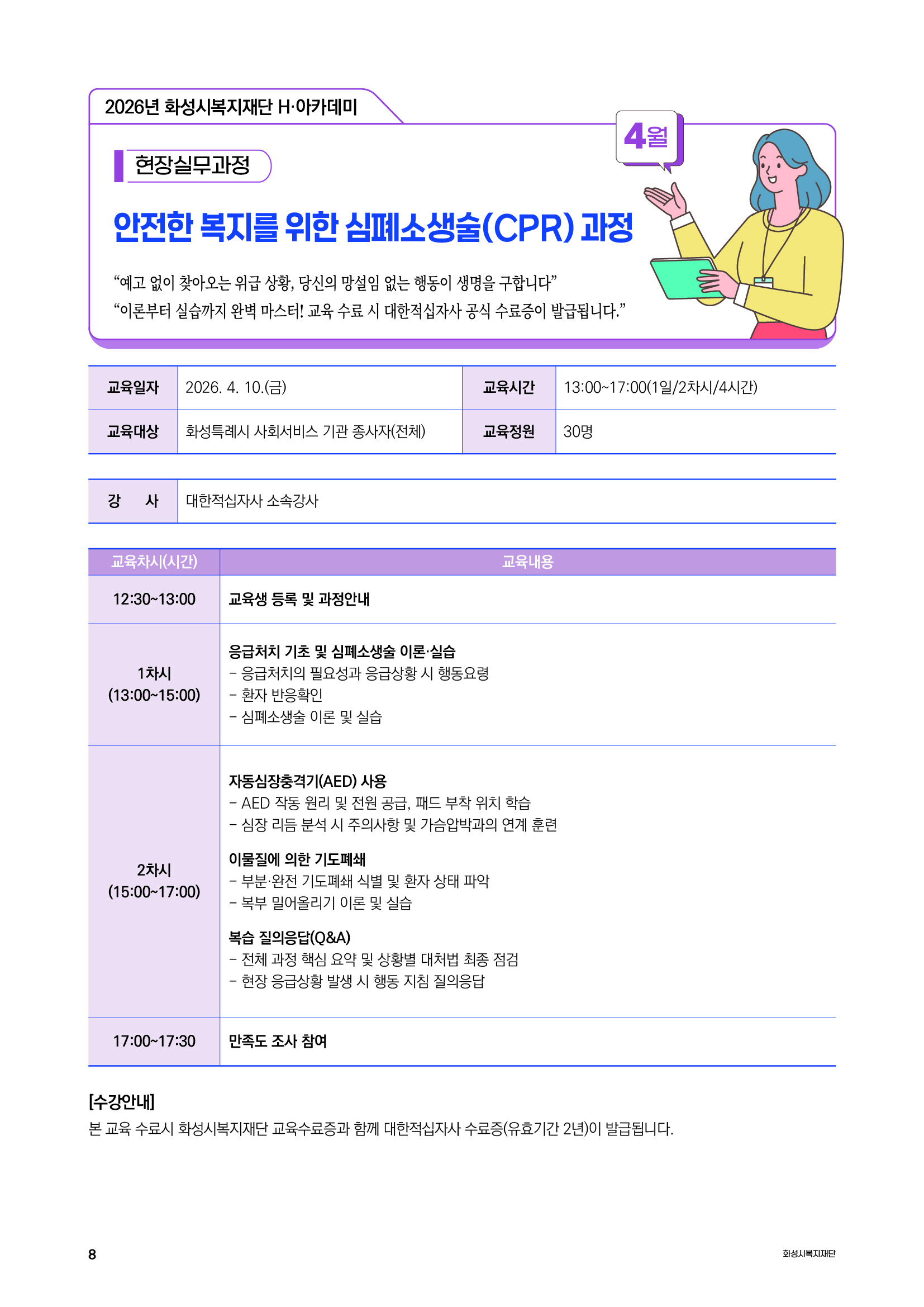 | 교육과정명 | 교육종료 현장실무과정 안전한 복지를 위한 심폐소생술(CPR)과정 | ||