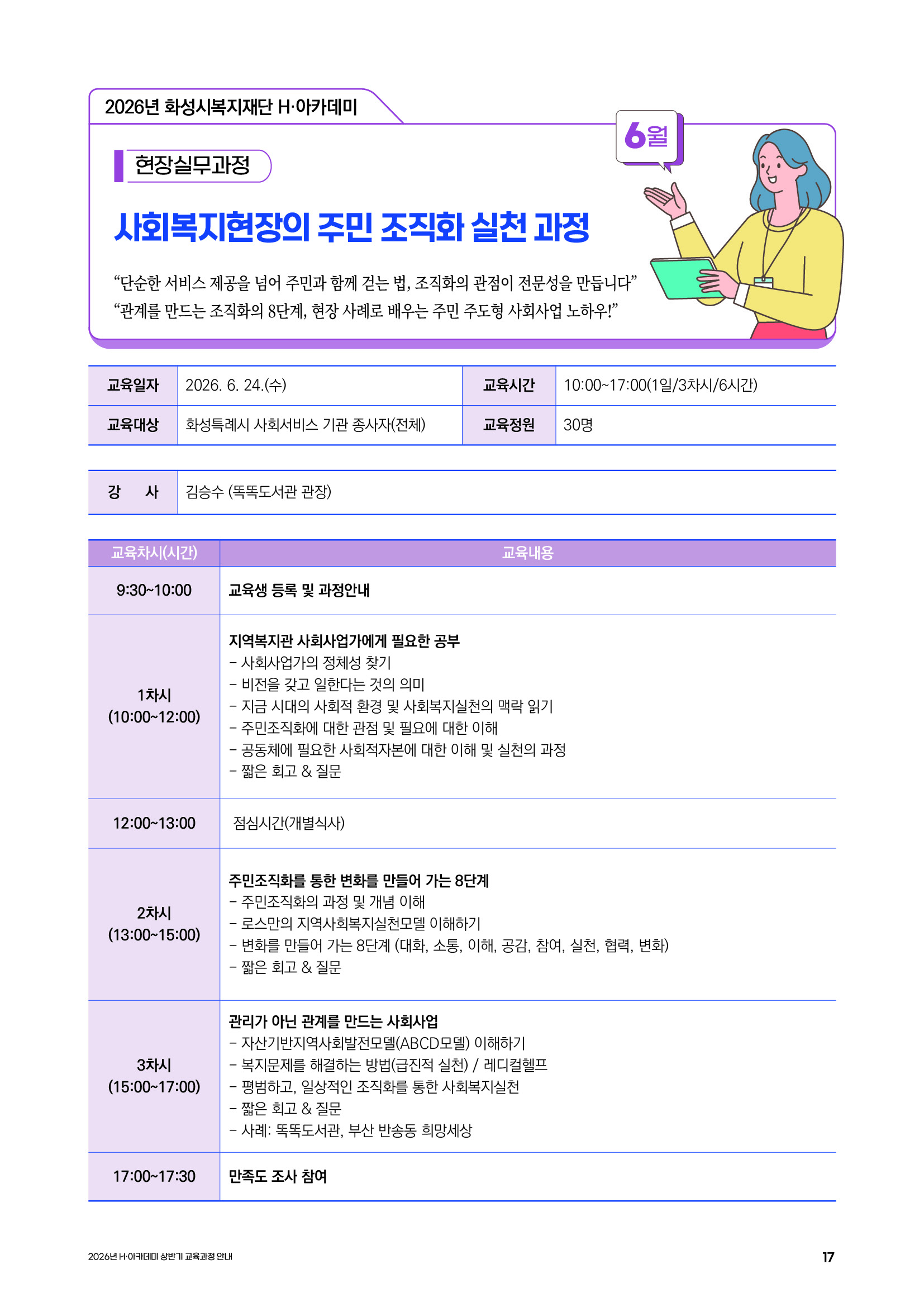 | 교육과정명 | 신청대기 현장실무과정 사회복지현장의 주민 조직화 실천 과정 | ||