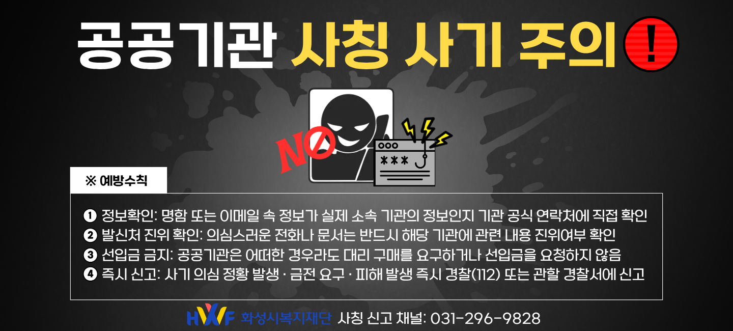 공지사항 공지사항 2026년 화성시 공공기관 경영실적평가 용역 고객만족도 조사” 관련 개인정보 제3자 제공사항 알림 “2026년 화성시 공공기관 경영실적평가 용역 고객만족도 조사” 관련 개인정보 제3자 제공사항 알림 □ 화성시복지재단은 정보주체의 동의, 법률의 특별한 규정 등「개인정보보호법」제17조 및 제18조에 해당하는 경우에만 개인정보를 제3자에게 제공합니다. □ 화성시복지재단은 다음과 같이 개인정보를 제3자에게 제공하고 있습니다.ㅇ 제공 일자 : 2026.03.12. ~ 2026.06.30.ㅇ 제공의 법적 근거 : 「개인정보보호법」제18조제2항제2호, 「공공기관의 운영에 관한 법률」제13조제2항, 동법시행령 제17조제3항ㅇ 제공받는 자의 개인정보 이용 목적 : 2026년 화성시 공공기관 경영실적평가 용역 고객만족도 조사 실시ㅇ 제공하는 개인정보 항목 : 고객명, 전화번호, 서비스 받은 업무명(사업)ㅇ 제공받는 자의 보유기간 : “2026년 화성시 공공기관 경영실적평가 용역” 완료시까지ㅇ 개인정보 파기 절차 및 파기 방법 : 조사 완료 후 정보 일체에 대해 복구 불가능한 방식으로 일괄 영구 파기 2026-04-22 공지사항 화성시복지재단 노사협의회 설치 관련 공고 화성시복지재단에서는 「근로자참여 및 협력증진에 관한 법률」제4조에 따라 노사협의회를 설치하고자 합니다. 노사협의회 설치에 앞서, 관련한 설치준비위원회 구성을 진행하오니,노사협의회 설치준비위원회에 근로자측 준비위원으로 참여하기를 희망하는 분은 붙임의 신청서를 작성하여 담당자(hj0125@hcare.kr)에게 제출하여 주시기 바랍니다. 2026-04-16 공지사항 2026년 화성특례시 사회서비스 종사자 휴식지원사업「힐링UP」참가자 선정공고 2026년 화성특례시 사회서비스 종사자 휴식지원사업 「힐링UP」참여자를 선정공고 합니다.자세한 사항은 첨부된 공고문을 참고해주시기 바랍니다. 2026-04-03 공지사항 화성시복지재단 2026년도 1차 직원 공개채용(블라인드) 최종 합격자 공고 화성시복지재단 2026년도 1차 직원 공개채용(블라인드) 최종 합격자를 붙임과 같이 공고합니다. 2026-03-24 공지사항 화성시복지재단 2026년도 1차 직원 공개채용(블라인드) 인적성전형 합격자 공고 화성시복지재단 2026년도 1차 직원 공개채용(블라인드) 인적성전형 합격자를 붙임과 같이 공고합니다. 2026-03-10 공지사항 2026년 H·아카데미 상반기 교육과정 안내문 (3월~6월) 2026년 상반기, 화성특례시 사회서비스 종사자 여러분의 직무 역량 강화와 성장을 돕기 위한 교육과정을 아래와 같이 공고합니다.교육 참여를 희망하시는 분들께서는 아래 안내문 내용을 확인하시고, 각 교육과정별 신청 기간을 엄수하여 교육 참여에 차질 없으시길 바랍니다. [ 목 차 ]- H·아카데미 수료기준 및 준수사항- 2026년 H·아카데미 상반기 교육일정- 2026년 H·아카데미 교육계획서 (현장실무과정 / AI디지털과정) 2026-03-09 공지사항 화성시복지재단 2026년도 1차 직원 공개채용(블라인드) 서류전형 합격자 공고 화성시복지재단 2026년도 1차 직원 공개채용(블라인드) 서류전형 합격자를 붙임과 같이 공고합니다. 2026-03-05 공지사항 2026년 화성특례시 사회서비스 종사자 휴식지원사업「힐링UP」참가자 모집공고 1. 모집내용□ 모집대상: 화성특례시 사회서비스 종사자 (화성특례시 사회서비스 기관 1년 이상 재직한 중간관리자 이하 종사자)□ 지원내용: 문화활동비 및 국내여행 경비지원구분대상인원선정 수지원금개인사회서비스 시설에 재직 중인 실무자1명총 100명1인당 250,000원 지원실무자 모임동일 또는 타 시설 실무자로 구성된 모임3~5명※ 개인·실무자 모임의 최종 선정 인원 및 팀 수는 신청 현황과 심사 결과에 따라 공정하게 결정되며, 전체 지원 규모(100명) 내에서 균형 있게 배분하여 선발 예정 □ 모집유형○ 개인 신청- 대상: 사회서비스 종사자 개인(1인)- 성격: 개인의 선호에 맞춘 자유로운 문화활동 및 국내여행을 통한 휴식 지원- 지원: 선정 시 개인별 지원금(25만원) 지급 및 개별 결과보고 진행 ○ 실무자 모임 신청- 대상: 동일 기관 동료 또는 타 기관 종사자와 함께 활동하고자 하는 3~5인 실무자 모임- 성격: 네트워크 형성, 동료 간 유대감 강화, 소통 등을 위한 모임 단위 휴식 지원- 지원: 대표자 1인이 구성원을 확정하여 신청, 선정 시 구성원 전원 지원금 지급 2. 지원 자격 및 준수 사항□ 지원자격 ○ 「사회복지사업법」 제2조에 근거한 사업을 수행하고 있는 법인·기관·단체 소속의 종사자 ○ 「건강가정기본법」에 따른 가족센터 종사자 ○ 경기도, 화성시 조례에 근거한 사회복지 및 사회서비스 관련 법인·기관·단체 종사자 ○ 「협동조합기본법」에 근거하여 설립된 협동조합에서 복지 및 사회서비스 관련 사업을 수행 하고 있는 조합원 또는 종사자 ○ 화성특례시 사회서비스 분야에 1년 이상 재직하였으며 중간관리자 이하인 실무자 □ 지원조건 ○ (교육) 사전 힐링교육 참여 필수(3회 중 1회 날짜 선택) ○ (활동) 선정 후 4개월 이내 힐링 활동 실시 ○ (ESG) 활동내용에 ESG 반영(제로웨이스트 실천, 플로깅, 대중교통 이용 등) ○ (보고) 활동 종료 후 7일 이내 활동보고서 및 만족도조사 제출 ○ 